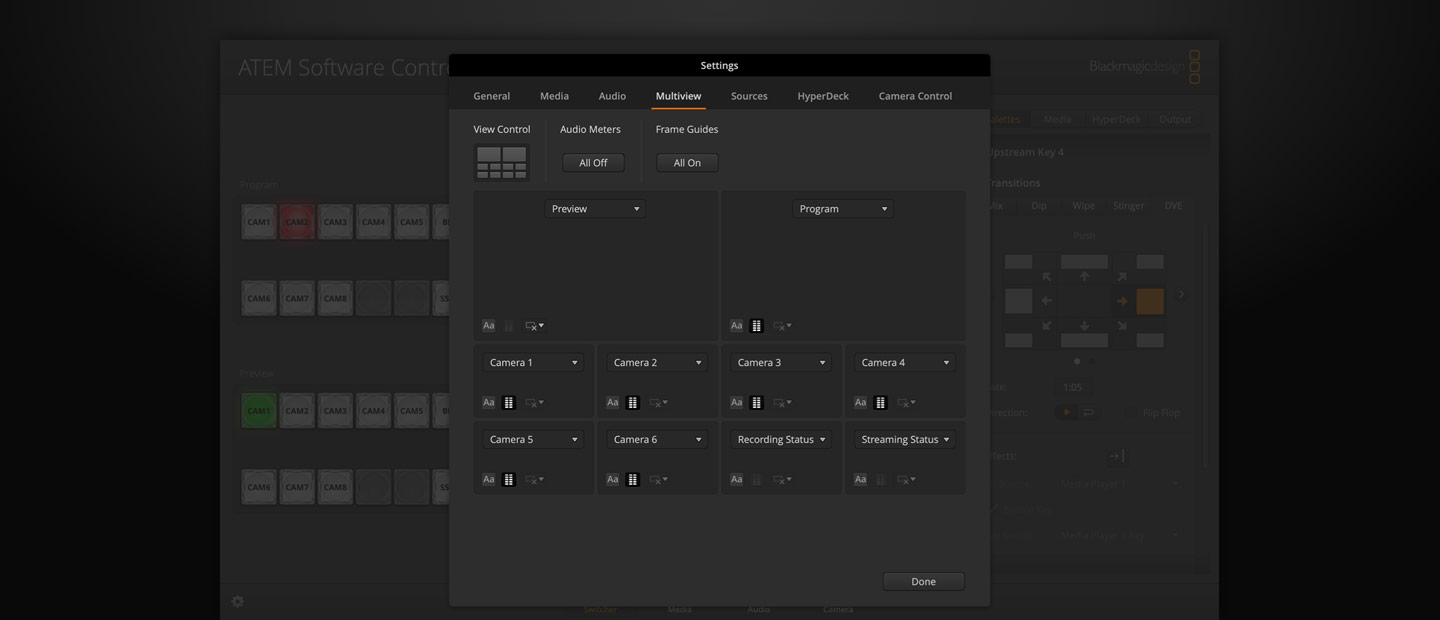 ATEM SDI can be operated from the front panel, or you can control it using the included free ATEM Software Control for Mac or Windows. ATEM Software Control gives you even more control and creative options! You can switch video sources live, load the media pool with graphics, use transitions and keys, change switcher settings and mix audio.