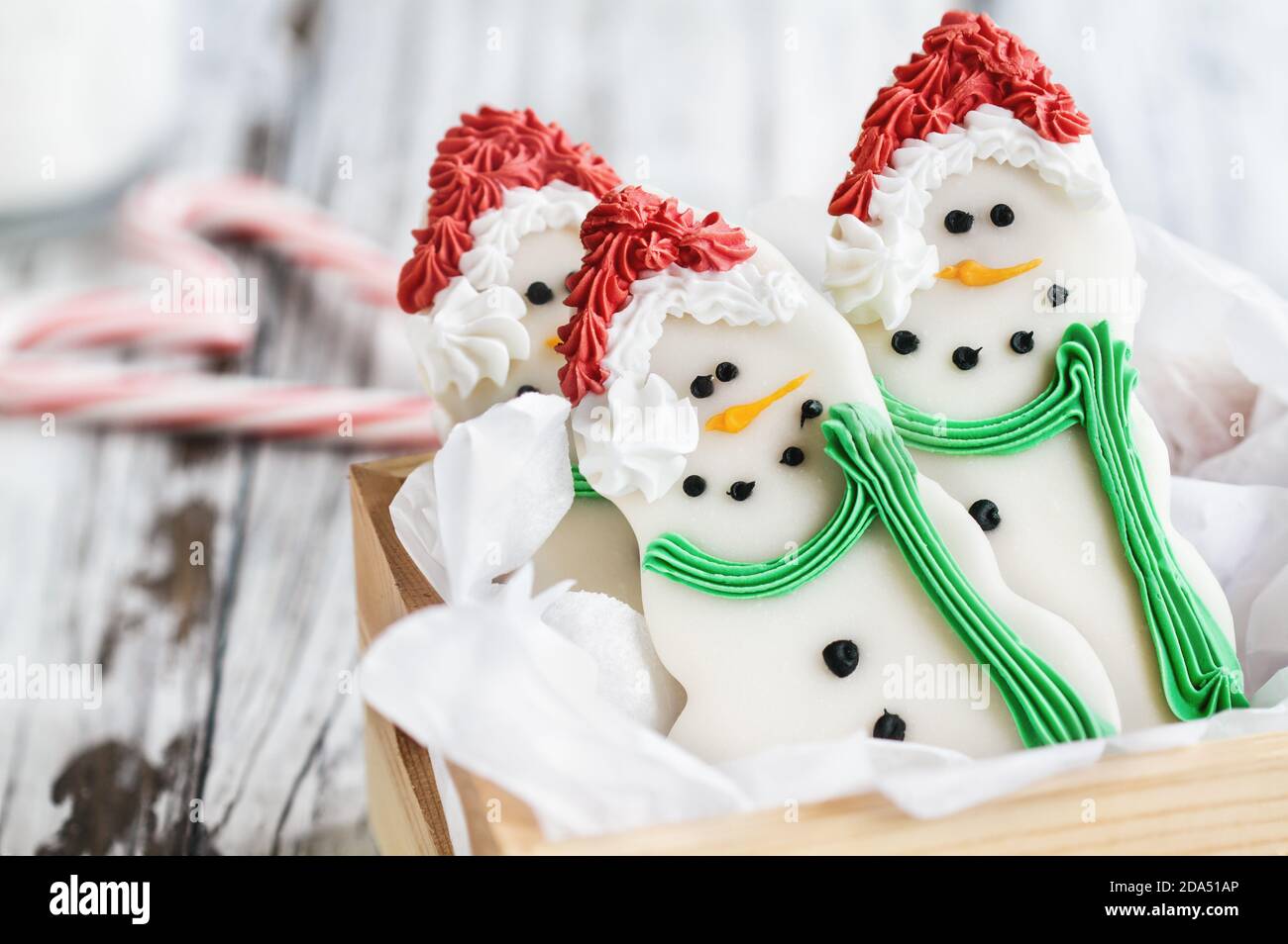 Galletas o galletas de muñeco de nieve heladas de Navidad con nariz de