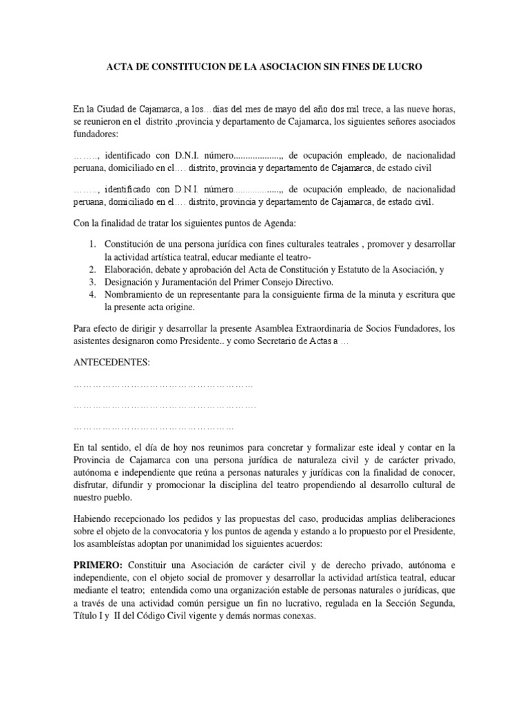 Acta de Constitucion de La Asociacion Sin Fines de Lucro PDF
