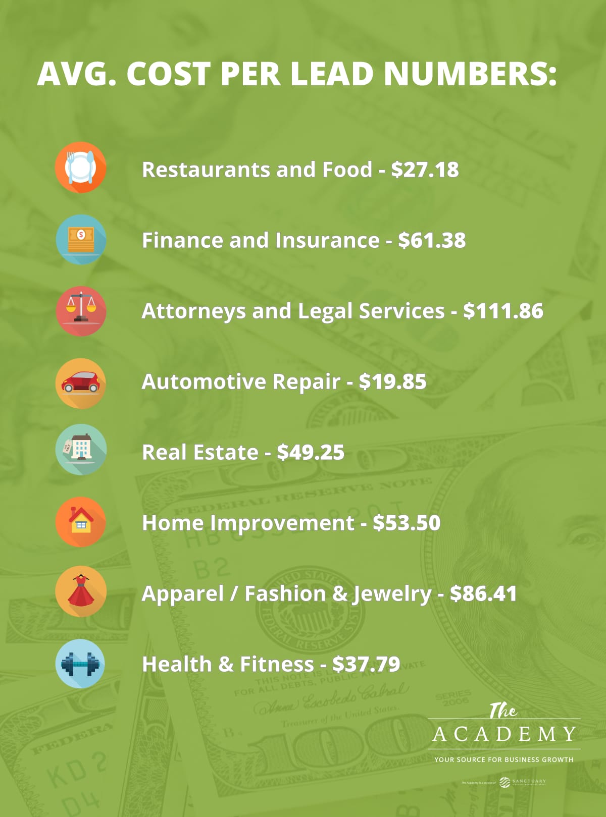Here are some generalized cost-per-lead benchmarks by industry. While the average cost per lead by industry can range from $187 (athletic club) to $480 (home improvement), it's important to put those numbers in perspective. Some businesses track lead costs as a percentage of sales. Some industries have a high volume of leads and low average.