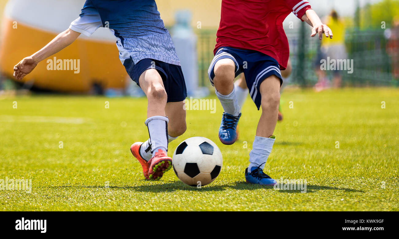 Jóvenes futbolistas de la competencia. Los muchachos pateando fútbol balón. Los equipos