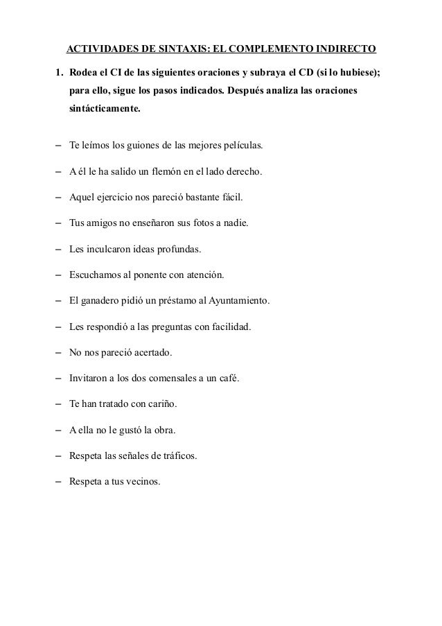 2. Vídeos explicativos CI. 3. Ejercicios de CD y CI. Ejercicios sencillos de CD (PDF) Ejercicios sencillos de CI (PDF) 33 ejercicios de CD y CI (Avanzados, PDF) Ejercicios de CD y CI con pronombres personales átonos (PDF) Teoría y ejercicios descargables de sintaxis sobre identificación y análisis del complemento directo y del indirecto.