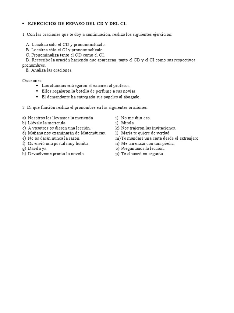 EJERCICIOS DE REPASO DEL CD Y DEL CI. 1. Con las oraciones que te doy a continuación, realiza los siguientes ejercicios: A. Localiza sólo el CD y pronominalízalo. B. Localiza sólo el CI y pronominalízalo. C. Pronominaliza tanto el CD como el CI. D. Reescribe la oración haciendo que aparezcan tanto el CD y el CI como sus respectivos.