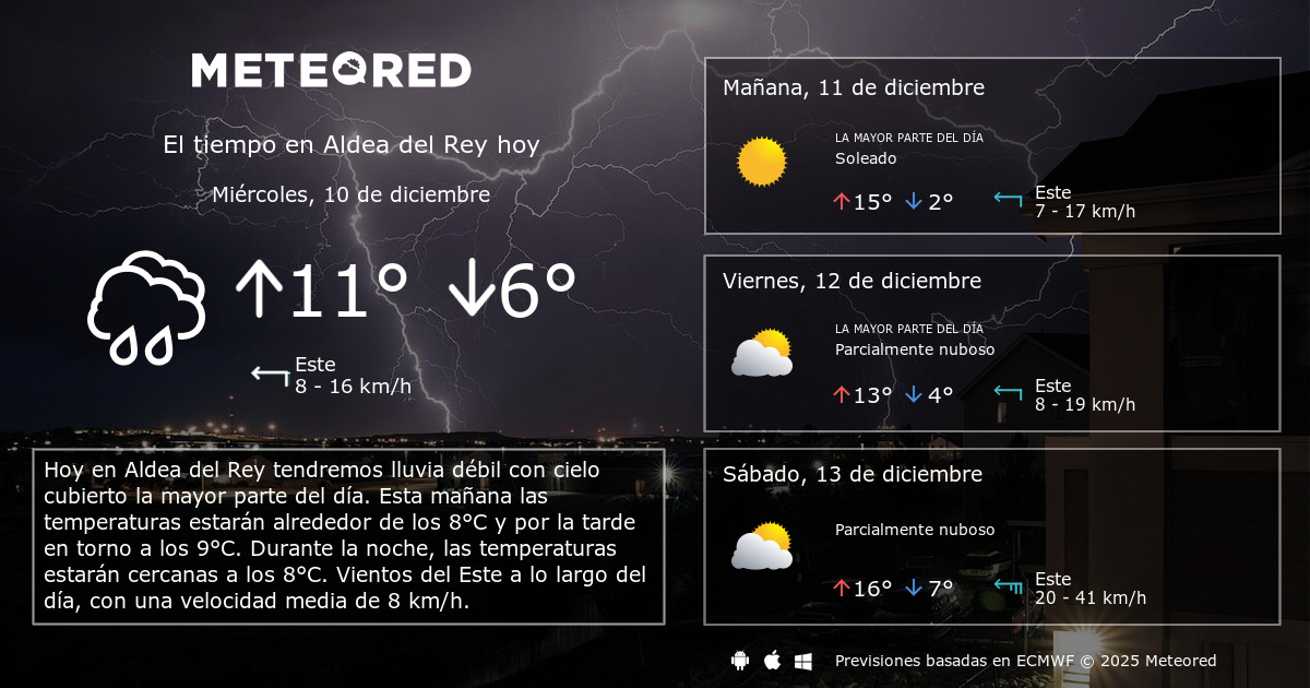 MultiModel. El Tiempo en Aldea del Rey para los próximos días. Radar de precipitación, imágenes de satélite HD, y avisos meteorológicos actuales, temperaturas, probabilidad de lluvias y velocidad del viento.