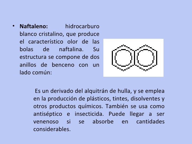 Naftaleno. El naftaleno, C 10 H 8, es una de las sustancias que se obtienen del alquitrán de hulla en mayor cantidad. Se encuentra también en pequeñas cantidades en el petróleo de diversas procedencias y destila en la fracción del kerosene, pero no es obtenido de esta fuente en cantidades industriales. Sumario. 1 Propiedades. 2 Estructura.