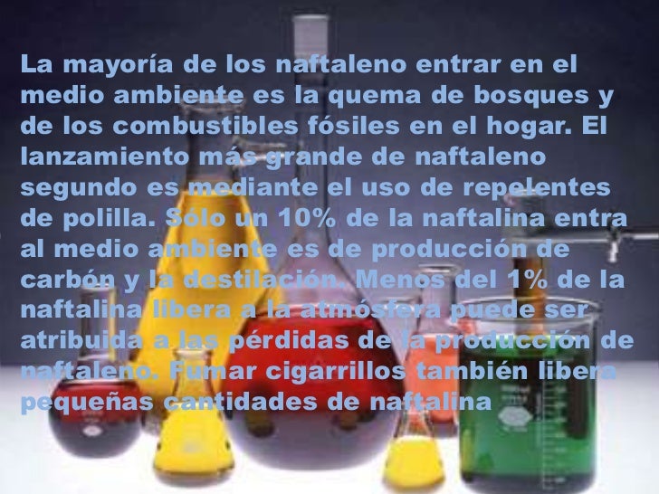 La naftalina (nombre no comercial: naftaleno; 8 fórmula química: C 10 H 8) es un sólido blanco que se volatiliza fácilmente y se produce naturalmente cuando se queman combustibles. También se llama alquitrán blanco y se usado en bolas y escamas para ahuyentar las polillas. Quemar tabaco o madera produce naftalina.