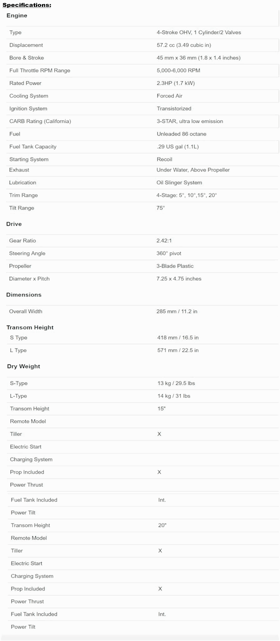CA Proposition 65. Horsepower: 2.3. Shaft Length: 20″ ( 15" short shaft available) Only Honda manufactures a 2.3 HP outboard with a 20 inch long shaft, and that is only the beginning of what makes this 2.3 HP outboard special. The Honda 2.3HP BF2.3DHLCH features more power over it's predecessor, plus a 12% larger internal gas tank allows for.