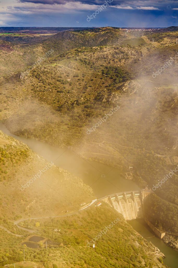 Paisaje de montaña y río Duero con presa española Saucelle. Frontera entre Portugal y España