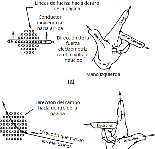 Reglas de (a) inducción y (b) motor. Otra conveción usa el segundo dedo para indicar la dirección del flujo de corriente positivo (la cual es contraria a la dirección del flujo de electrones), en cuyo caso la mano derecha se usa para generadores y la mano izquierda para motores. Existen otras variaciones de estas reglas.
