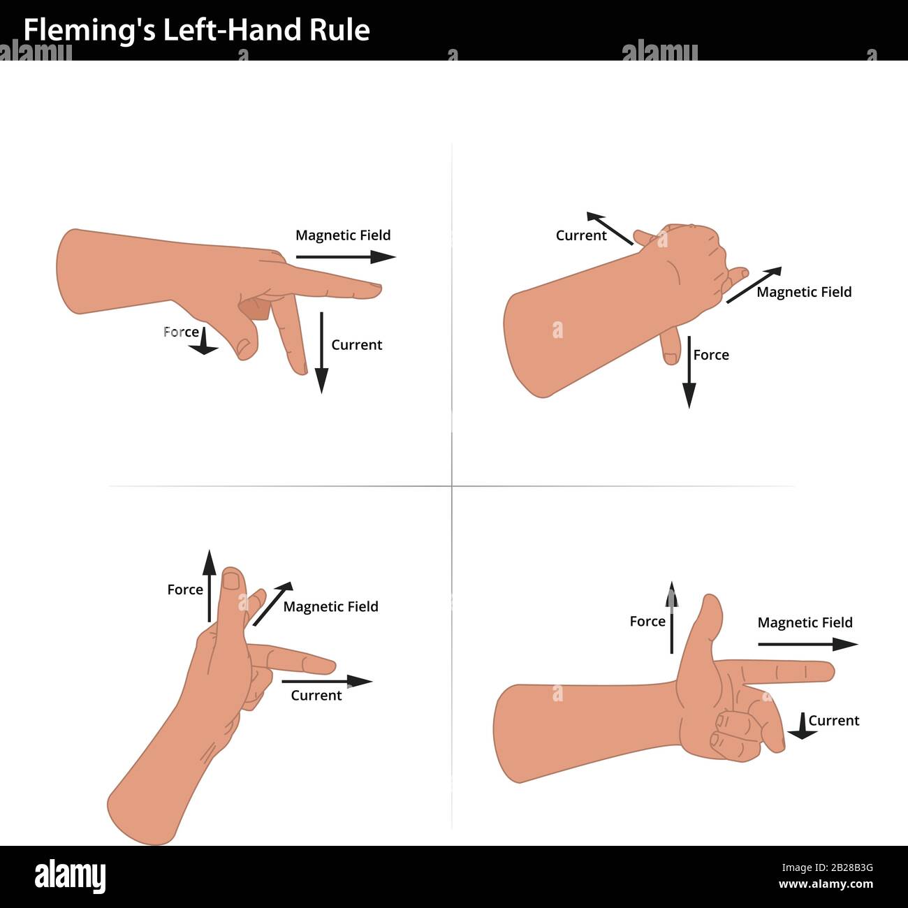 La regla de la mano izquierda de Fleming se puede utilizar para encontrar la dirección del flujo de corriente en un conductor colocado en un campo magnético. mano izquierda de Fleming "Haz un ángulo recto (90°) con el pulgar, el índice y el dedo medio de la mano izquierda. Si el pulgar indica la fuerza o el movimiento aplicado, el primer.