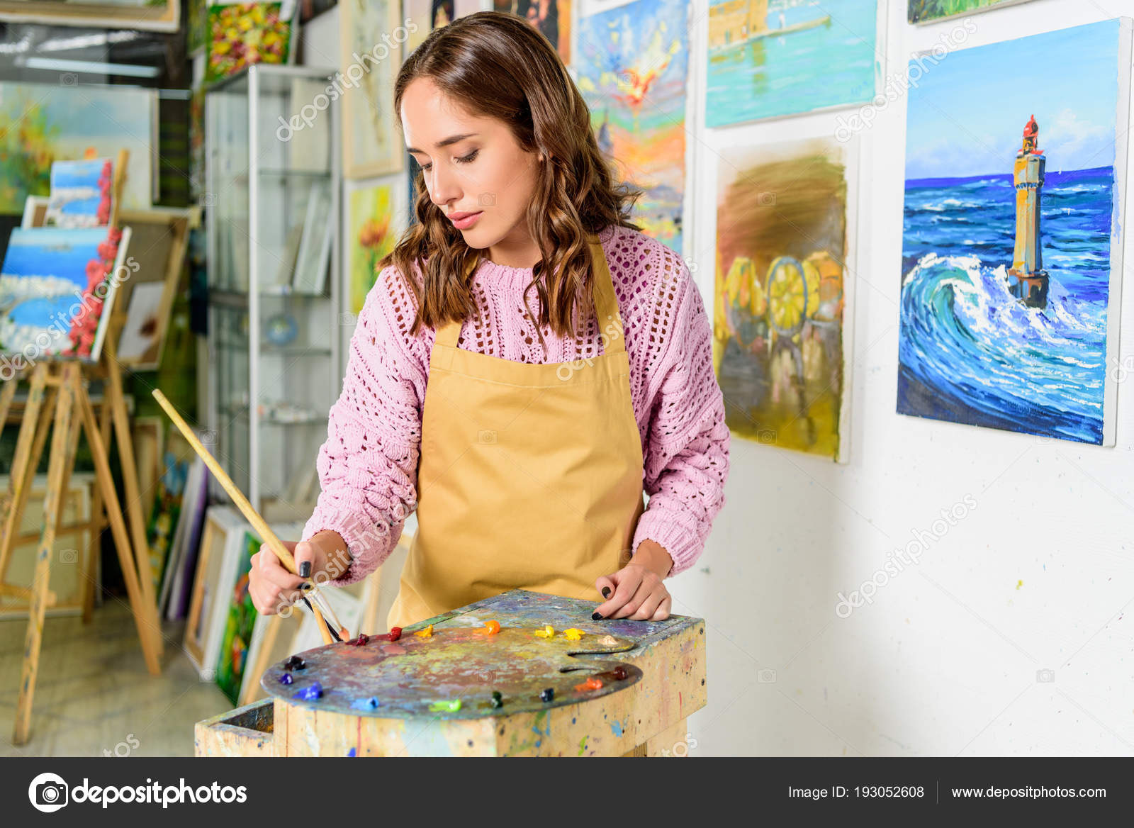 Hermosa Artista Femenina Aplicando Pinturas Paleta Taller Foto de