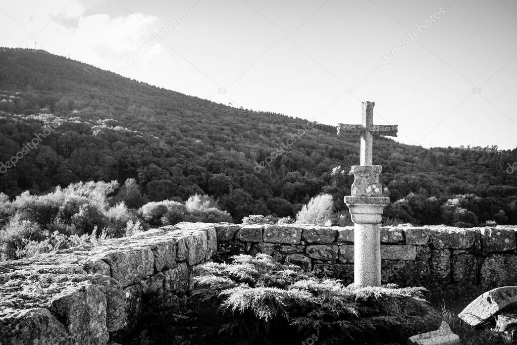 Cruz de piedra en Santuario de A Franqueira en Galicia (España), templo